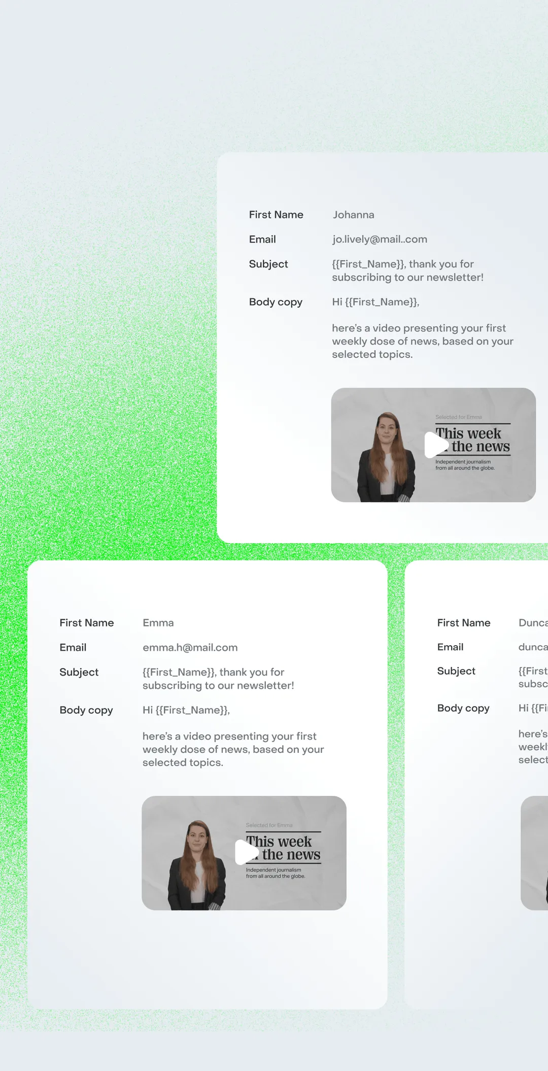 Use your avatar to send personalized videos and branded landed pages to each contact in your CRM. Bump up qualified leads and conversion rates with videos crafted for individuals, made at scale.
