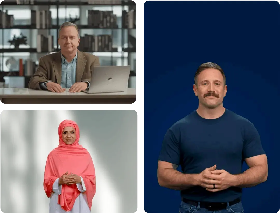It’s you. Well, an AI version of you that speaks 175 languages, moves naturally, and always follows the script. Create your own avatar with just a webcam, or use one of our avatars.